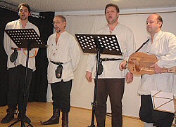 Hubertus Krämer skizzierte zur Vernissage kurz die Ausstellung und die Bilder des Künstlers Reinhard Rögner. Die Sammelhandschrift "Carmina Burana" aus dem Kloster Benediktbeuren beinhalte bekannte Kompositionen aus dem Mittelalter. Erst 1847 sei der gesamte Kodex der Liedersammlung herausgegeben worden, von keinem Geringeren als dem gebürtigen Tirschenreuther Sprachforscher Johann Andreas Schmeller. Richtig berühmt wurden die Lieder erst 1937, als sie von Carl Orff neu vertont wurden. Einige Ausschnitte aus diesen Kompositionen boten die "Mitterteicher Nachtwächter" in lateinischer und deutscher Sprache. Musik- und Bildinterpretationen sollen jedermann den Weg zu der bekannten oder unbekannten "Carmina Burana" öffnen, hoffte Krämer.