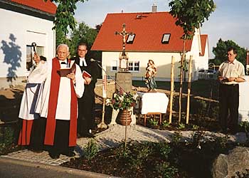 Die Bürger des neuen Ortsteils im Dichter- und Denkerviertel (Goethe-, Schiller-, Lutherstraße) waren in großer Zahl erschienen, ebenso aber auch Interessierte aus dem gesamten Stadtgebiet. Das Wetter zeigte sich an diesem Abend wieder einmal von seiner besten Seite. In seiner Begrüßung berichtete der Arbeitskreisvorsitzende Werner Männer, wie aus dem umgestürzten Kreuz eine jetzt schöne Anlage geworden sei. Den Helfern sprach er seinen herzlichen Dank aus. Bürgermeister Roland Grillmeier bedankte sich für den Einsatz des Arbeitskreises und freute sich darüber, inmitten einer großen Gemeinschaft einen neuen Treffpunkt einweihen zu können. Er versprach auch weiterhin Unterstützung durch die Stadt.