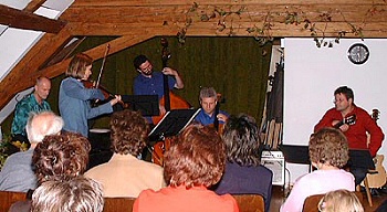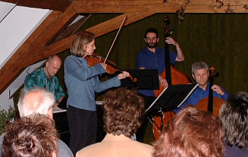 Wolfgang Charanza, am Klavier und ansonsten Organist in Mitterteich sowie Leiter des Kirchenchores Arzberg, fungiert als Moderator. Er stellt die Musiker vor: Bernhard Helmstreit am Kontrabass ist gefragter Bassist in der nördlichen Oberpfalz und Mitglied von "Bluesick" sowie dem Trio "Chefin". Seine Stilrichtungen: Blues, Jazz oder Klassik. Als Dozentin für Violine und Viola arbeitet Johanna Luther an der Franz-Grothe-Musikschule Weiden, Dozent für Gitarre an der selben Schule ist Klaus Luther. Als fünfter im Bunde gehört Janusz Ludwig Skutella dazu, selbstständiger Musiklehrer und Kammermusiker.