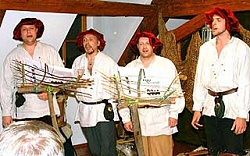 Scheinbar von einer Wallfahrt heimkehrend betraten die Akteure singend und Trommel schlagend („Heit gemma Wollfoahrn”) den Konzertraum. Von da an zündeten sie ein Feuerwerk mittelalterlicher Sanges- und Spielkunst. Hubertus Krämer, Albert Prommersberger, Hans Possehn und Reinhard Rögner wussten mit deutschen und englischen Madrigalen und Villanellen, aber auch instrumental vorgetragenen Tänzen des 16. Jahrhunderts zu überzeugen. Auch sehr zum Vergnügen angereister Gäste aus der englischen Partnergemeinde Cheddleton/Wetley Rocks. Mit Liedern wie „Since Robin Hood”, „Though Pilomela lost her Love” brachte die Gruppe heitere Weisen zu Gehör. Für sichtbare Erheiterung sorgte besonders „Hans im Schnakeloch”. Sehr interessant auch die vierstimmige Interpretation von „My Bonny lass she smileth”. Alle vier Sänger stammen aus der Formation „Music&More”, die unter Krämers Leitung unter anderem auch die Madrigale des 16. Jahrhunderts im Konzertprogramm hat. Mit Erläuterungen zur Geschichte und den Geschichten rund um die Weisen sowie einer kleinen Instrumentenkunde nahmen Hubertus Krämer und Hans Possehn die englischen und deutschen Gäste im Raum mit ins Mittelalter. Die begeisterten Zuhörer forderten am Ende sehr nachhaltig eine Zugabe, die mit „Come again sweet love” und dem traditionellen „Nachtwächterlied” gegeben wurde. Es erklang während des anschließenden Weinabends noch öfters, jeweils auf die volle Stunde den aktuellen Stimmungen zugetextet. Jetzt erklangen mehr G'stanzln und Couplets aus dem Volk mit sehr deftigen und schelmischen Textzeilen.